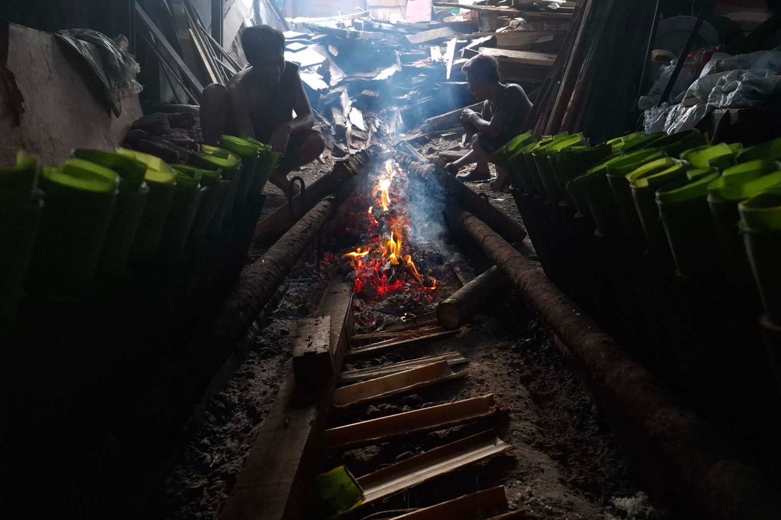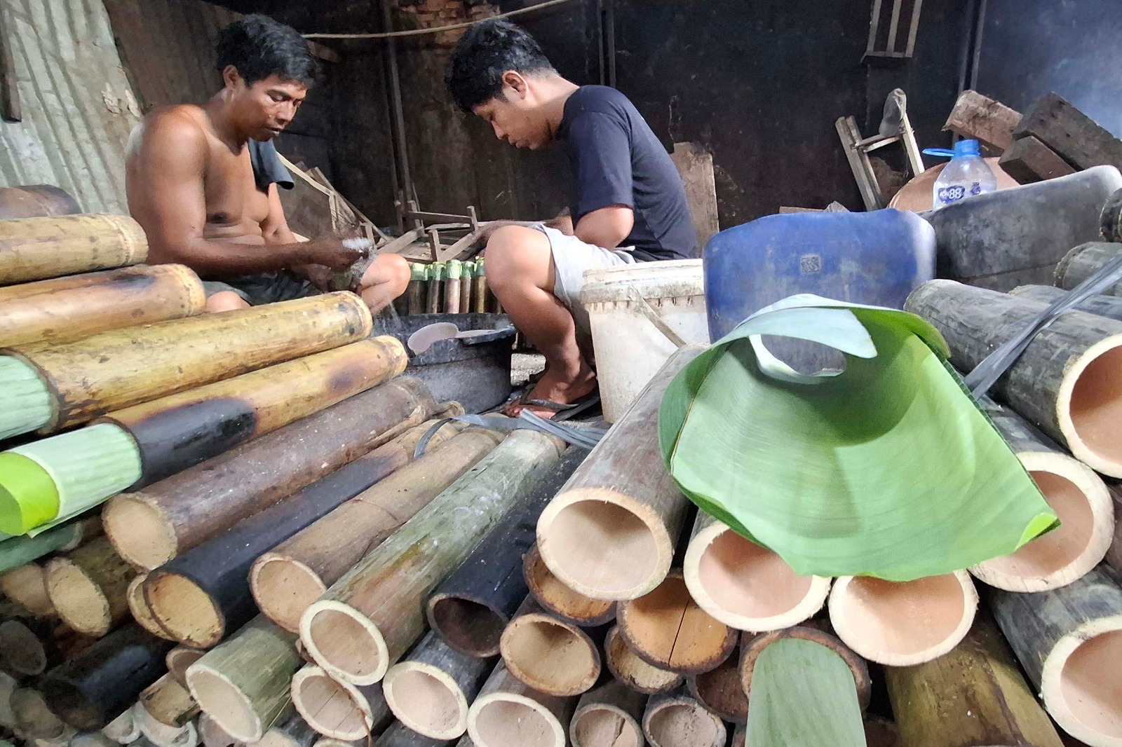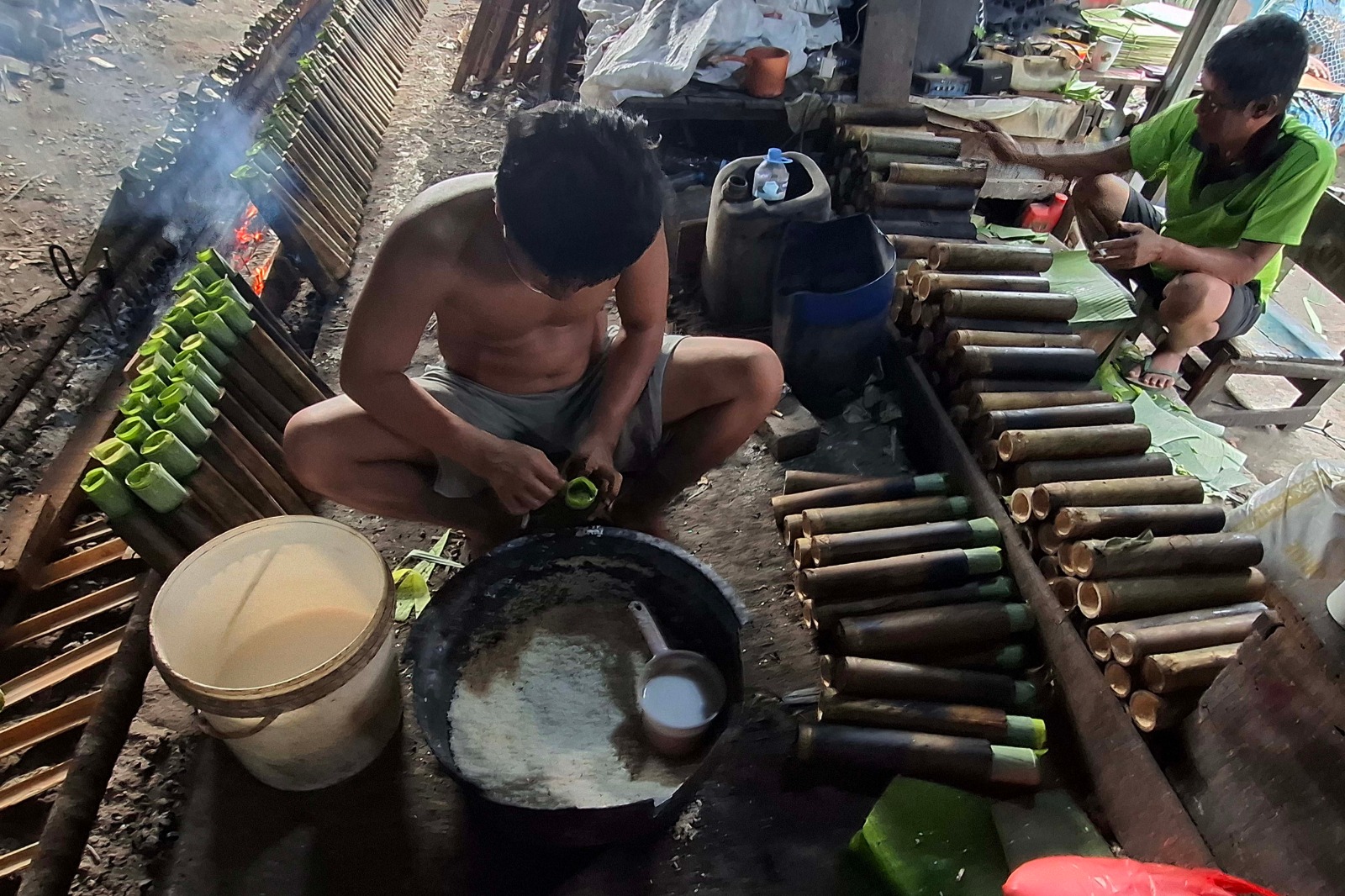 Jakarta, ThedailyID — Workers prepare lemang bambu, a traditional Minangkabau snack from West Sumatra, at a home industry in Kramat Senen, Central Jakarta, Monday (March 16). They mix glutinous rice with coconut milk and cook it inside bamboo over fire.